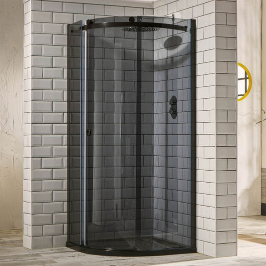 Aquaglass Sphere Curved Offset Quadrant Shower Enclosure, Tinted Glass w/ Cut-Out Top Panel & 1 Elongated Side Panel & Sliding Door (Right Hand)