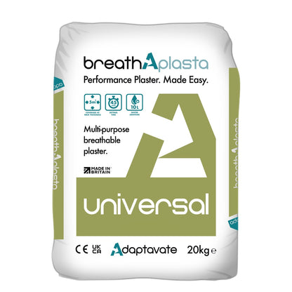 Breathaplasta UNIVERSAL from Adaptavate is a quick setting, high performance, multi-purpose plaster designed for rapid build-up onto a wide range of backgrounds, including plasterboard, wood fibre board, wood wool board, overcoating existing plaster surfaces and for rapid build-up onto solid masonry construction (brick, block, and stone).