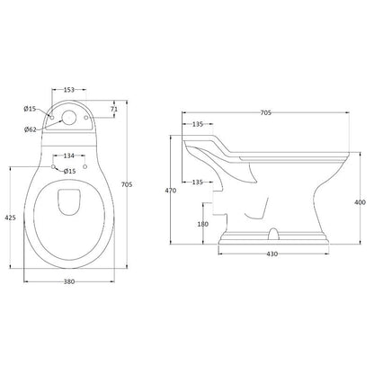 The toilet pan has a height of 470mm, width of 380mm, and depth of 705mm.