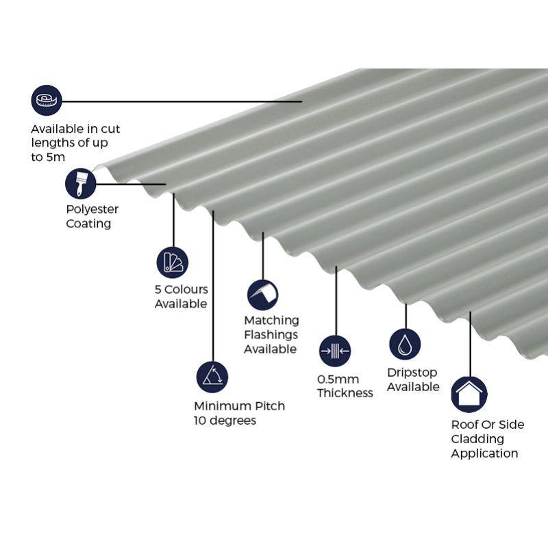 Our steel roof corrugated sheets give the look of a traditional 13/3 corrugated iron cladding profile, and has 13 corrugations of 3 inch/76mm round, with a width coverage of 990mm when installed. This sheet gives the look of traditional corrugated iron cladding that has been used for over a century for a traditional look.