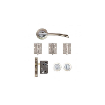 Bathroom pack contains pair of handles, 1 x latch, 3 x ball bearing hinges, 1 x bath turn and release.