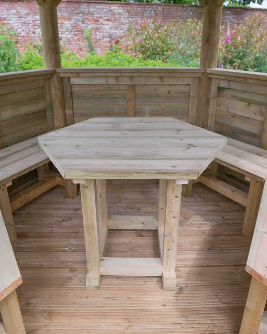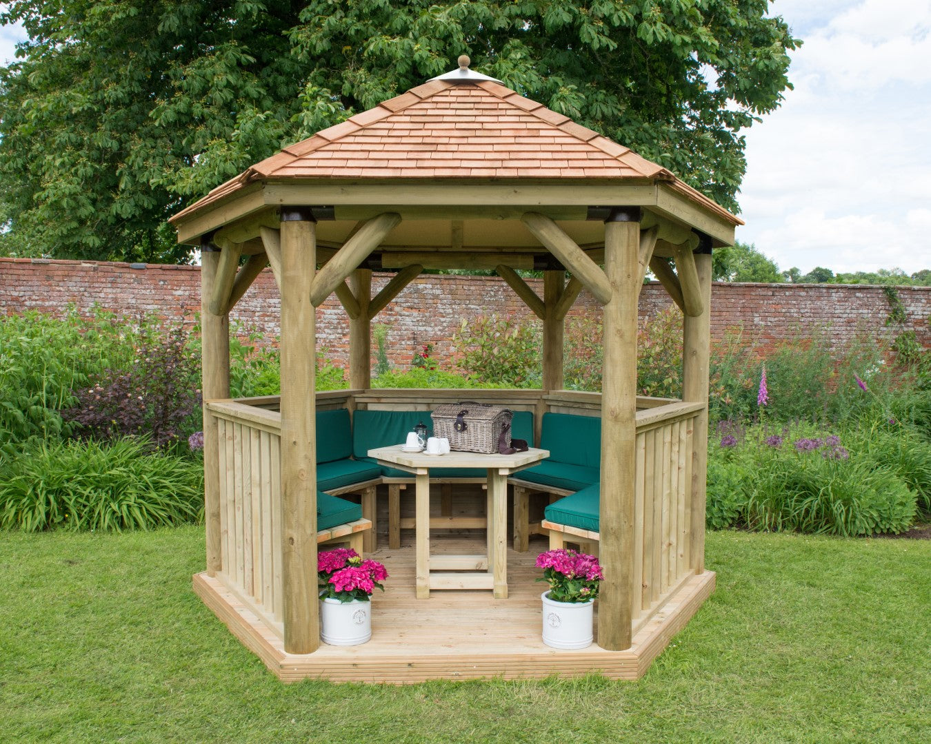 - The 3m Furnished Hexagonal Wooden Garden Gazebo with Cedar Roof is a compact but striking garden feature