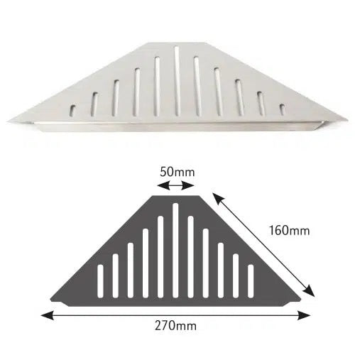 Stylish shower shelf in brushed stainless steel finish. Fits in 90 degree corners. The shelf attaches in the grout joint with silicone - no drilling required! Shower shelf can be tiled in during installation or fitted retrospectively.