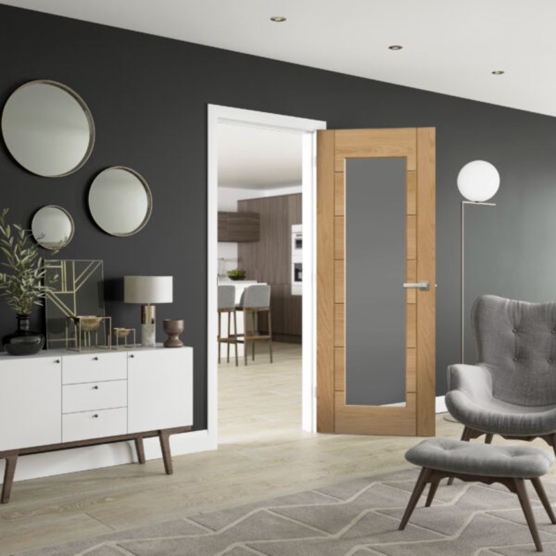 The door features a clear glass panel, which allows light to flow seamlessly between rooms.