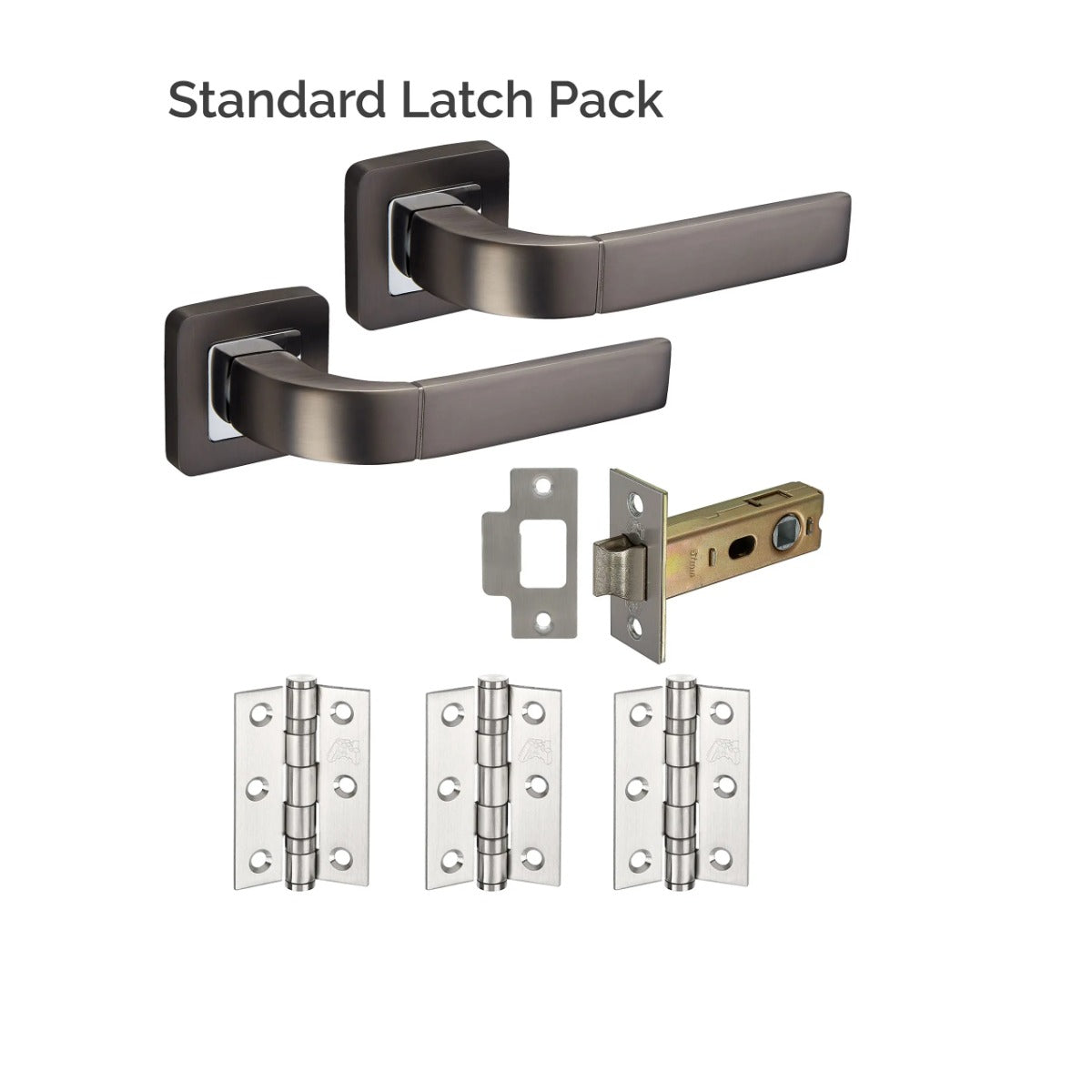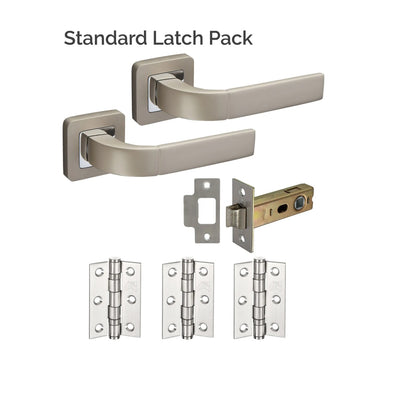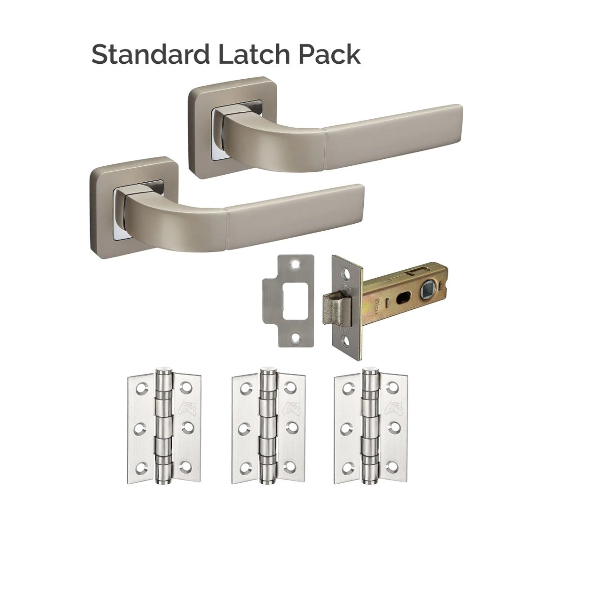 - Standard pack includes: pair of lever handles, 3 x ball bearing hinges, a tubular mortice latch and strike plate
