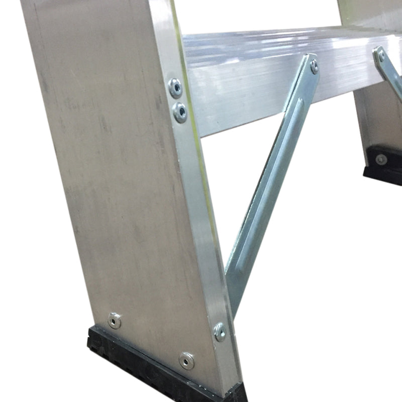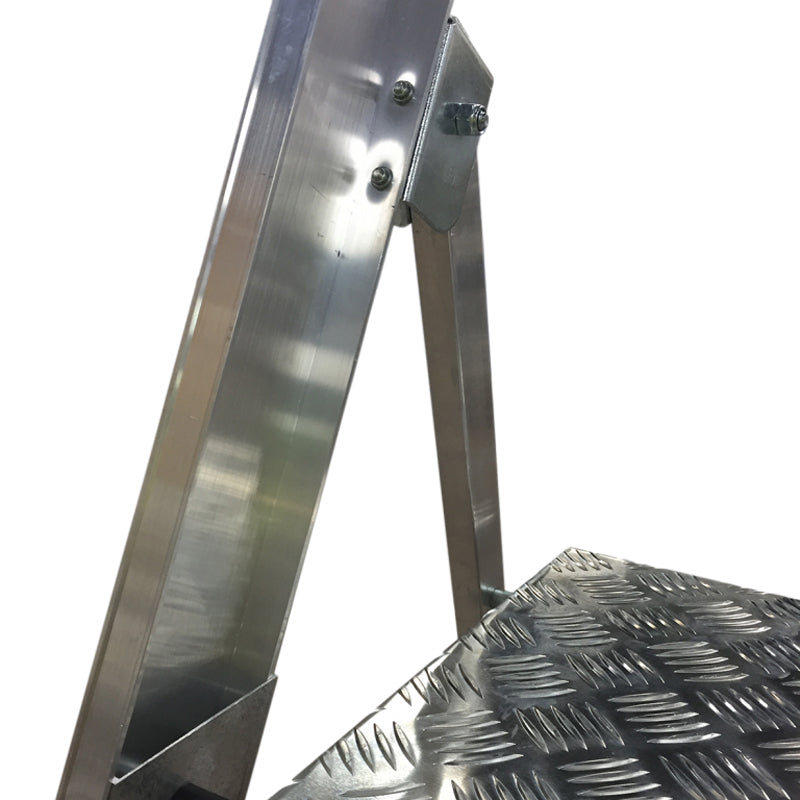 LFI TuFF K3 Aluminium Platform Stepladders In BS EN131-2:2010 + A2:2017, newly improved torsion & stiffness tests meet. Tested on a gruelling 50,000 cycle "climbing" durability test, it has all of the BS2037 Class 1 strength requirements. Graded to 150kgs maximum load and service. Wide 80 mm serrated non-slip treads with reinforced ridge and double riveting at each corner for optimum durability and comfort when operating at high altitude. Broad ribbed channel section stiles, back legs box section, steel hinge & strengthened bottom tread & horns for improved heavy-use resistance. 3 mm thick, heavy duty, 5 bar high grip surface checker board.