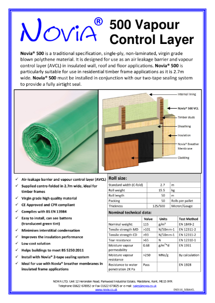 Novia VCL is a low-cost, medium and high specification, blown polythene material, suitable for use as a vapour control layer within the walls of timber frame constructions, or where the control of the passage of water vapour is required.