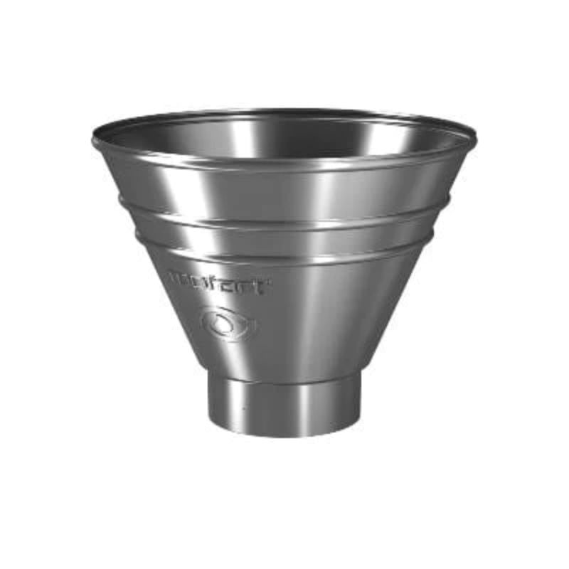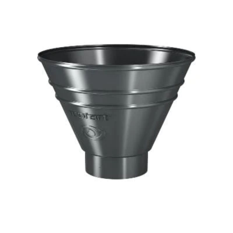 Round Hopper allows more water flow directly from end of gutter rather than via outlet. It can be used to channel water coming from multiple gutter runs. Decorative round design with Roofart stamp on the front.