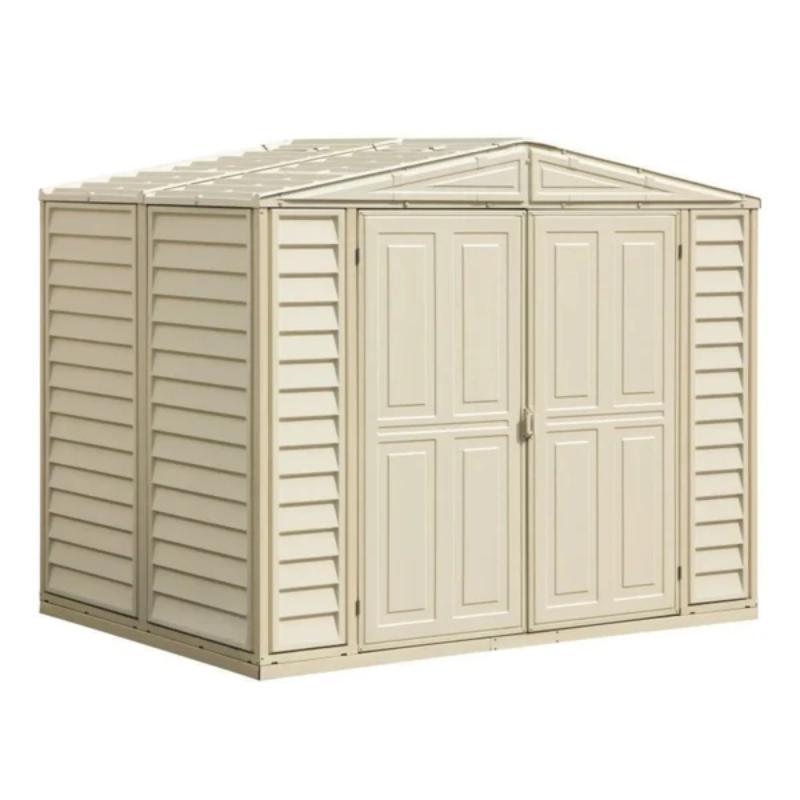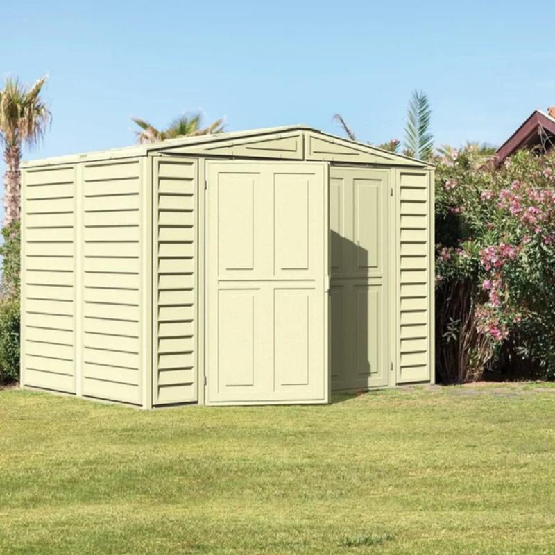 The shed is vinyl beige in colour, adding elegance to your garden.