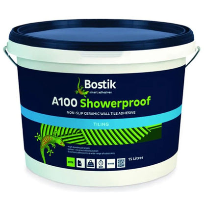 Bostik showerproof is a PVA tile adhesive suitable for use as a thin bed adhesive. Showerproof can be used for most applications of cermic wall tiles. It is suitable for use in internal dry wall applications such as kitchens, bathrooms and correctly grouted domestic showers.