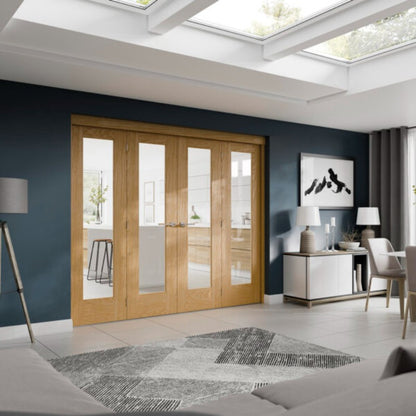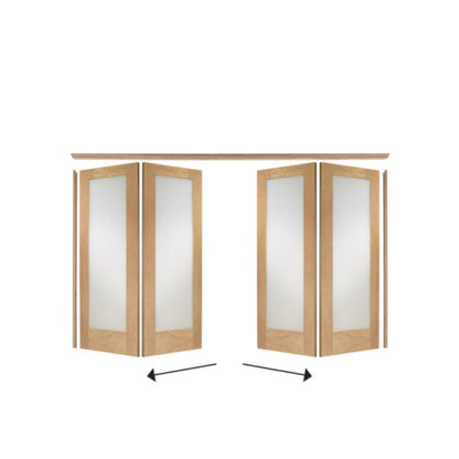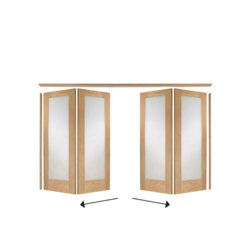 The Freefold provides the option to either fold open all doors to create one large room for entertaining or close them to create two separate living spaces. Available on any 24" internal oak door. The Freefold includes a head, jambs and stops as well as a floor mounted guide and all hardware (excluding handles). The Freefold is a top hung system. System shown with Pattern 10 Oak Doors.
